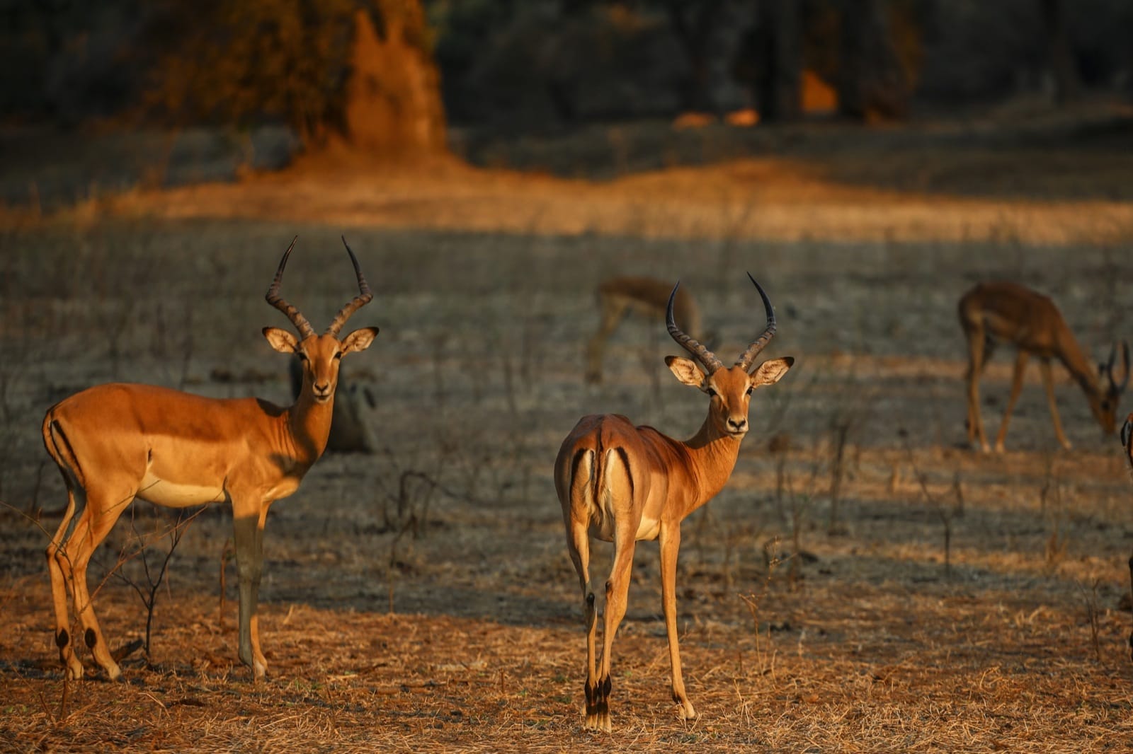 Our route will continue back to the Makuti junction where we’ll get supplies for our 4 days camping at the Mana Pools National Park. The limited space of the car was full of our luggage, the necessary water for 5 people and some basic food we found to buy, like crackers and some packaged cheese that we didn’t hope to preserve under that heat. But the biggest issue was the car’s fuel autonomy. The old vehicle with a small tank, combined with the weight of 5 adults with luggage, reduced significantly the available range in these remote areas. Even on the main road leading to Zambia, there was no gas station, except from the border area! This forced us to travel 40 km to the border town of Chirundu and another 40 back to the entrance of the National Park. Moreover, the country’s unreasonable bureaucracy required another 15 kms back and forth to be registered at the park office that was weirdly far from the entry gate. Finally, passing the iron bar, we pressed deeply the accelerator pedal creating a red cloud of dust following us. On the horizon of the straight dirt road we often encountered some impalas, initially surprised and then frightened, escaping with huge jumps. After about 80 kms we reach the park’s command center, which was decorated around with skulls and bones of large mammals. The park offers nothing to visitors except fire wood. We need to save on our drinking water and of course to stay fasting for 3 days. Our concern with the available fuel, prompted us to ask for some help. Perhaps another visitor would go back to civilisation on the next few days. At some point, a helicopter was parked, and some children of the guard’s families welcomed us with enthusiasm. The guards showed the spot where we could set up our camp on the elevated bank of the Zambezi river, which is the natural border with Zambia. But our spot was occupied by some other campers who refused to leave. After long discussions and with the assistance of the officers they realized that their stay had ended. All that time I was absorbed with an elephant mother and her calf, that chose that point on the river bank to quench. Mom was calm, but when I approached beyond a certain limit her behavior was obviously nervous. Mana Pools National Park was at that time the only one in Africa where unguarded walks were allowed, with the individual responsibility of the visitors. Some deadly incidents had caused a change of policy in 2015. The truth is that we didn’t see anyone else walking around in the savanna between the wild beasts. The few visitors in that isolated national park were South Africans with large 4X4 vehicles and roof tents. Some had hired armed rangers. We, taking advantage of the loose rules, were parking the car in various remote spots, walking away for up to 6 kms, looking for the lions that were seen one day before devouring an elephant calf. Fortunately we did not find them. With caution, we were looking behind the bushes if a lion herd was resting, in one of my most frivolous moments of travel. We were competing with the antelopes as who’s more tasty for a lion’s menu, while we were trying to move as a compact group, to appear as a deterrent mass. Apart from the countless antelopes, there was a large number of elephants, big carnivorous birds, hippos and crocodiles in the river bank areas, and also a herd of buffalos, one of the most irritating and dangerous animals. All these on foot, face to face. At one point, one of my companions stayed behind, near out car that we parked next to the Zambezi bank. Due to a misconduct, we believed he would stay there, but he followed us alone, causing him stress, slipping into a stream and scratching his foot. He came to us almost in tears, giving us blame and too much importance to the odor of blood from his wound, that could attract predators. We reassured him that the girls of ย our team had periods so the beasts would prefer them instead. In the afternoon we returned, meeting elephant herds near the camp site and waiting for them to move as they were blocking the passage. Before the darkness fell, we set the tents, and the sun sank “setting fire” in the waters of Zambezi.